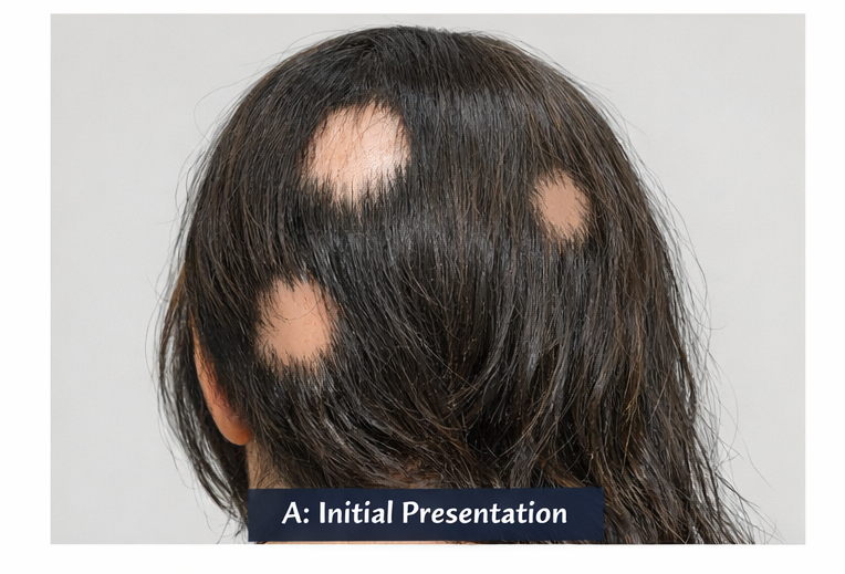 Given limited scalp involvement (<25% surface area) and absence of rapid progression, localized therapy was initiated. The patient was counseled regarding the autoimmune nature of the disease, unpredictable course, possibility of recurrence, and treatment expectations.