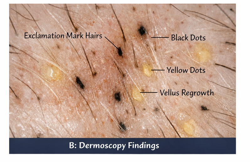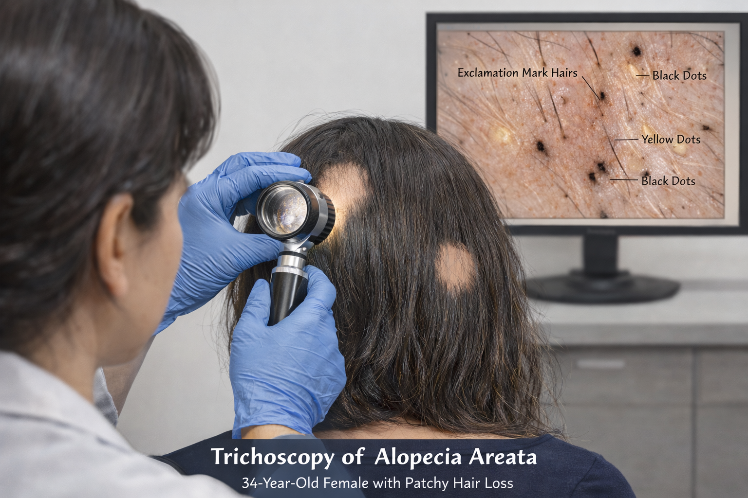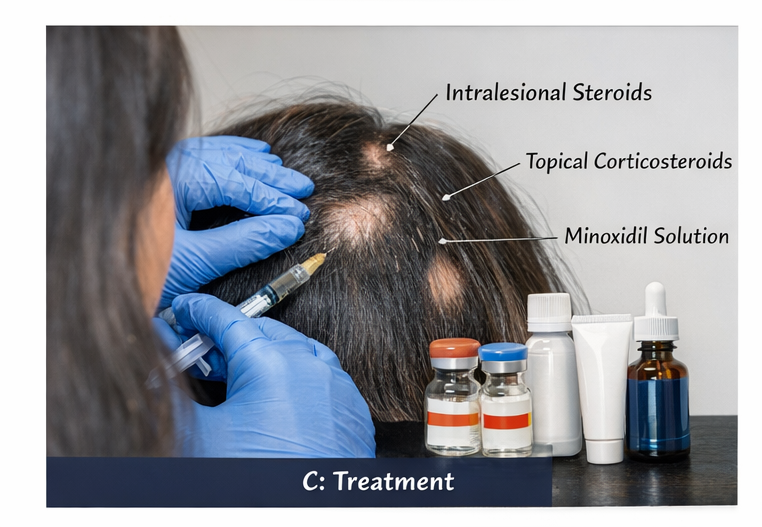 Alopecia areata is a chronic autoimmune hair disorder with significant psychosocial implications. Early recognition through clinical examination and dermoscopy allows timely intervention. Intralesional corticosteroids remain effective for localized disease, while emerging targeted therapies offer hope for extensive cases. Long-term follow-up is essential due to potential recurrence. Comprehensive management should address both medical and psychological aspects to optimize patient outcomes.