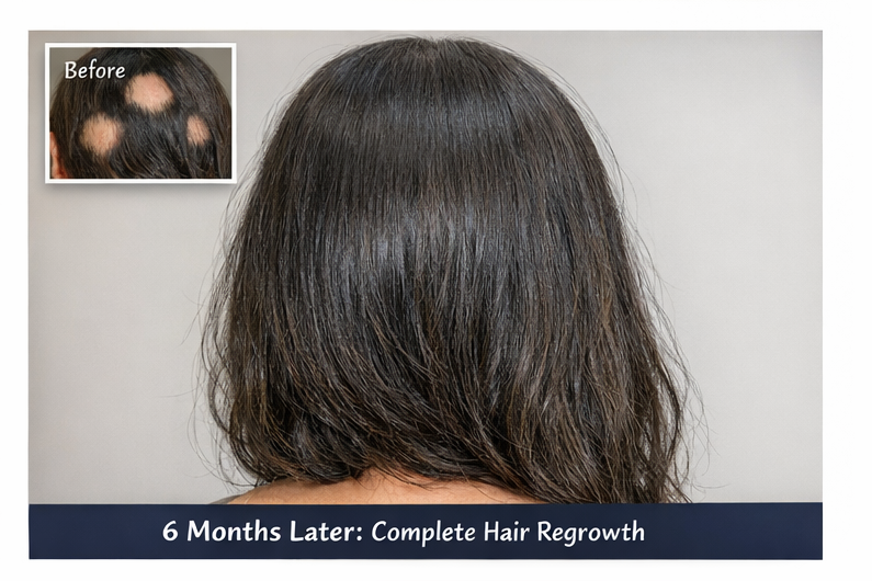 At 3 months, significant terminal hair regrowth was observed in two patches, with partial regrowth in the third. No new lesions developed.