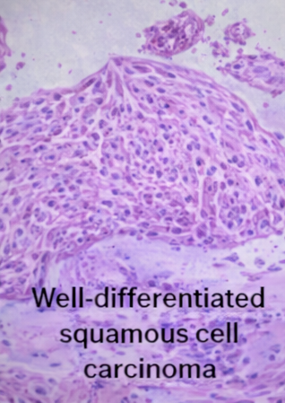 An incisional biopsy of the oral lesion was performed. Histopathological examination revealed invasive well-differentiated squamous cell carcinoma, characterized by malignant squamous cells forming keratin pearls and infiltrating the underlying stroma.
