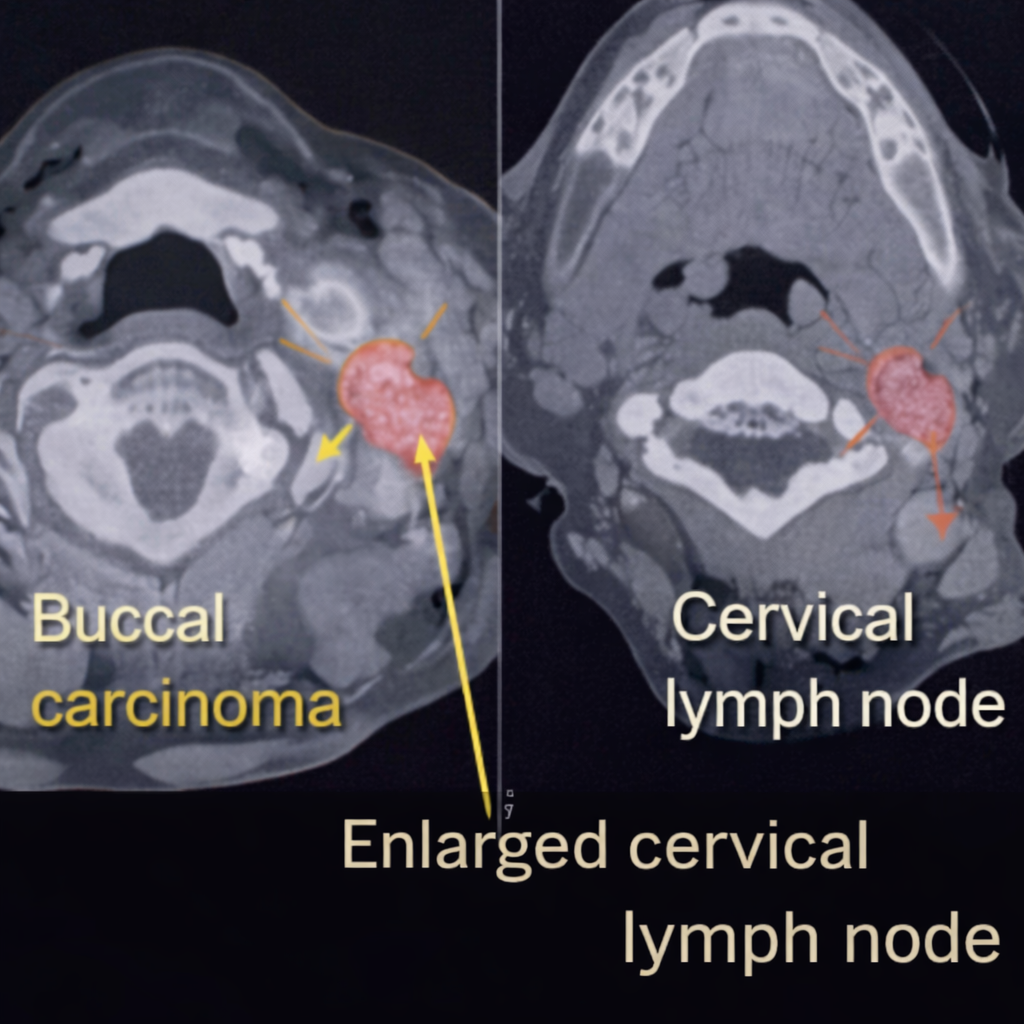 Contrast-enhanced computed tomography (CT) scan of the face and neck demonstrated a localized soft tissue mass involving the right buccal mucosa without mandibular invasion. A single enlarged right level Ib lymph node was noted, with preserved fatty hilum and no evidence of extranodal extension. Chest imaging showed no distant metastasis.