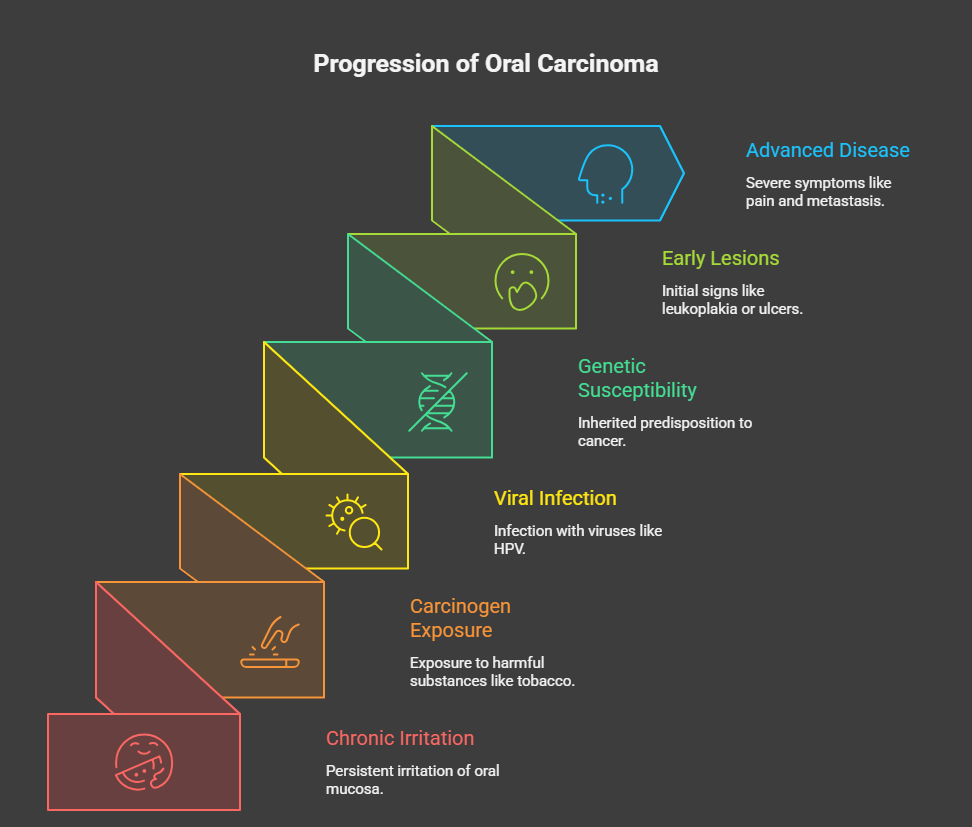 The pathogenesis of oral carcinoma is multifactorial, involving chronic mucosal irritation, exposure to carcinogens, viral infections such as human papillomavirus (HPV), and genetic susceptibility [2]. Common sites include the buccal mucosa, tongue, floor of the mouth, gingiva, and hard palate. Early-stage lesions may present as leukoplakia, erythroplakia, or small ulcers, whereas advanced disease is associated with pain, bleeding, trismus, dysphagia, and cervical lymph node metastasis.