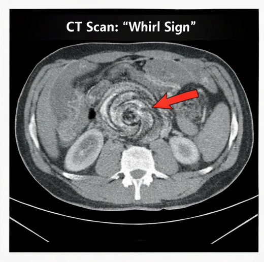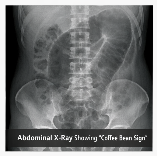 The classic presentation includes abdominal distension, abdominal pain, constipation, and vomiting. Radiological evaluation plays a critical role in diagnosis. Plain abdominal radiographs often demonstrate the coffee bean sign, while CT imaging provides more detailed visualization, including the whirl sign of twisted mesenteric vessels.